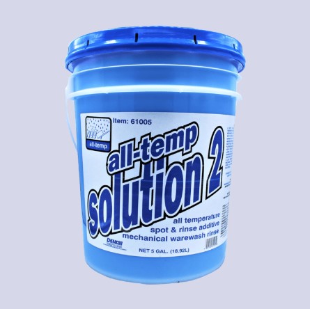 Hi & Low Temperature Rinse Aid Additive. A spot and rinse additive for Hi & Low temperature institutional and commercial mechanical warewashing machines. Blended with special wetting agents to effectively operate in all temperatures helping reduce water surface tension. Aids in the prevention of spotting, streaking, and hazing on glassware, flatware, and dishes. Promotes quicker drying. Helps prevent soil redeposition. For use in large scale institutional and commercial warewashing operations. Works quickly, safely, and effectively to sheet off water. Provides outstanding results when used in conjunction with Solutions 1 & 3.